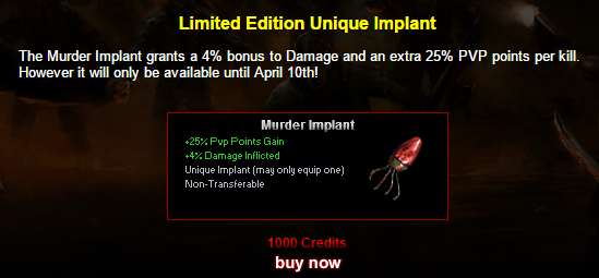 Today the Murder Implant has been released and will be available until April 10th, 2017. This implant offer 25% increased PvP point gain and 4% damage increase, only one can be equipped at a time. Time will tell how this will affect the competitive nature of PvP and this implant being a limited edition item.